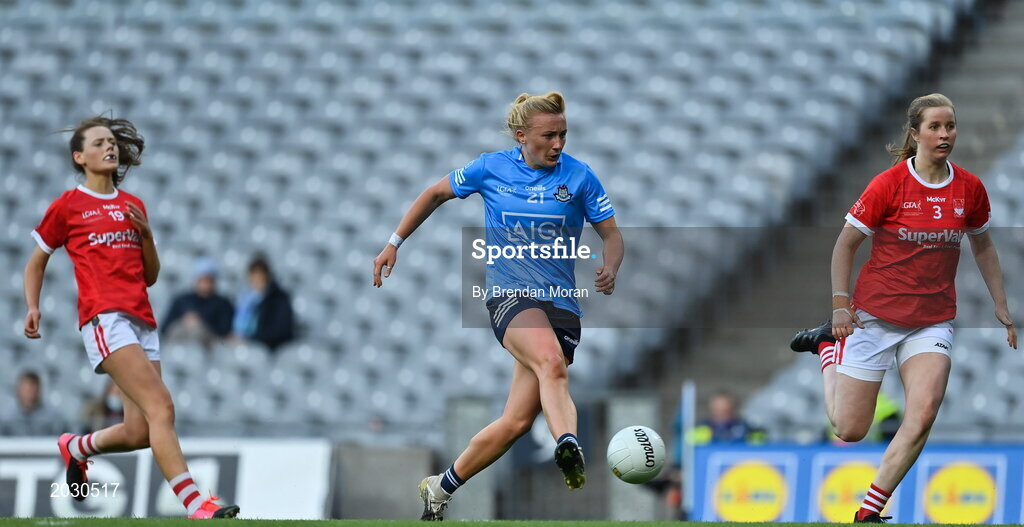 26 June 2021; Carla Rowe of Dublin scores her side's second goal during the Lidl Ladies Football National League Division 1 Final match between Cork and Dublin at Croke Park in Dublin. Photo by Brendan Moran/Sportsfile