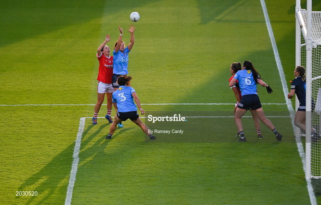 26 June 2021; Leah Caffrey of Dublin, supported by teammates Niamh Collins, left, and Olwen Carey of Dublin, in action against Eimear Scally of Cork, supported by teammate Bríd O'Sullivan, during the Lidl Ladies Football National League Division 1 Final match between Cork and Dublin at Croke Park in Dublin. Photo by Ramsey Cardy/Sportsfile