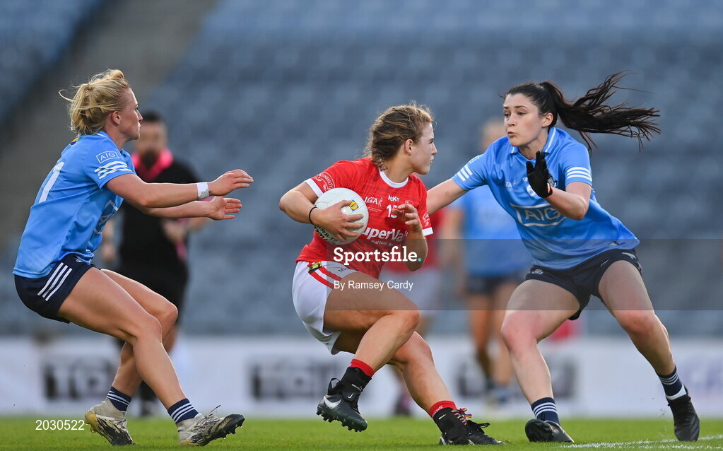 26 June 2021; Erika O'Shea of Cork in action against Carla Rowe, left, and Olwen Carey of Dublin during the Lidl Ladies Football National League Division 1 Final match between Cork and Dublin at Croke Park in Dublin. Photo by Ramsey Cardy/Sportsfile