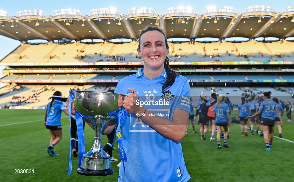26 June 2021; Hannah Tyrrell of Dublin celebrates with the cup the Lidl Ladies Football National League Division 1 Final match between Cork and Dublin at Croke Park in Dublin. Photo by Brendan Moran/Sportsfile