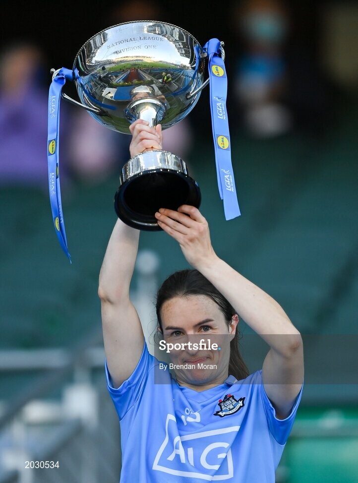 26 June 2021; Dublin captain Sinead Aherne lifts the cup after the Lidl Ladies Football National League Division 1 Final match between Cork and Dublin at Croke Park in Dublin. Photo by Brendan Moran/Sportsfile