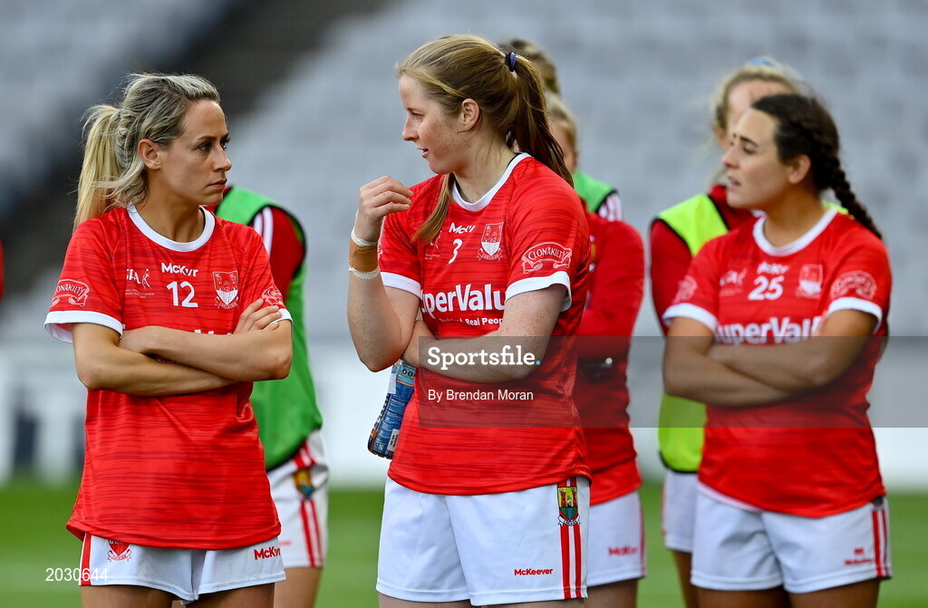 26 June 2021; Cork players, from left, Orla Finn, Róisín Phelan and Orlagh Farmer after the Lidl Ladies Football National League Division 1 Final match between Cork and Dublin at Croke Park in Dublin. Photo by Brendan Moran/Sportsfile