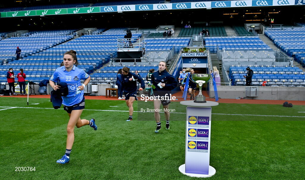 26 June 2021; The Dublin team run out past the Division 1 trophy before the Lidl Ladies Football National League Division 1 Final match between Cork and Dublin at Croke Park in Dublin. Photo by Brendan Moran/Sportsfile