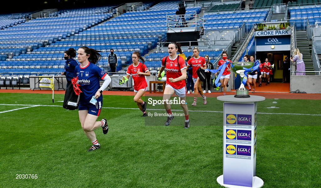 26 June 2021; The Cork team run out past the Division 1 trophy before the Lidl Ladies Football National League Division 1 Final match between Cork and Dublin at Croke Park in Dublin. Photo by Brendan Moran/Sportsfile