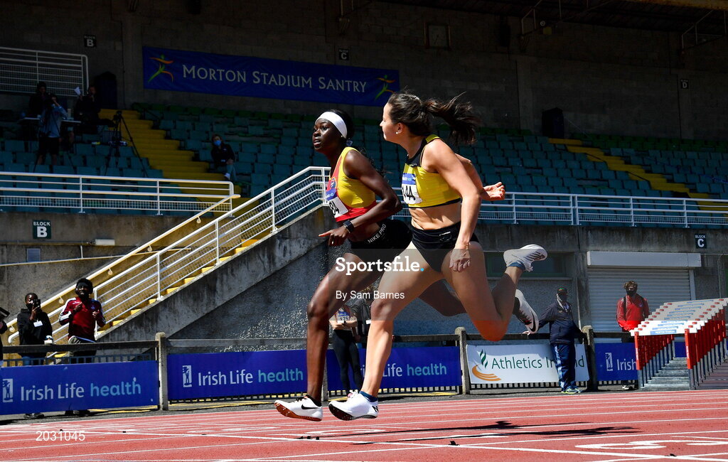 27 June 2021; Phil Healy of Bandon AC, Cork, right, dips for the line to win the Women's 200m ahead of Rhasidat Adeleke of Tallaght AC, Dublin, left, who finished second, during day three of the Irish Life Health National Senior Championships at Morton Stadium in Santry, Dublin. Photo by Sam Barnes/Sportsfile