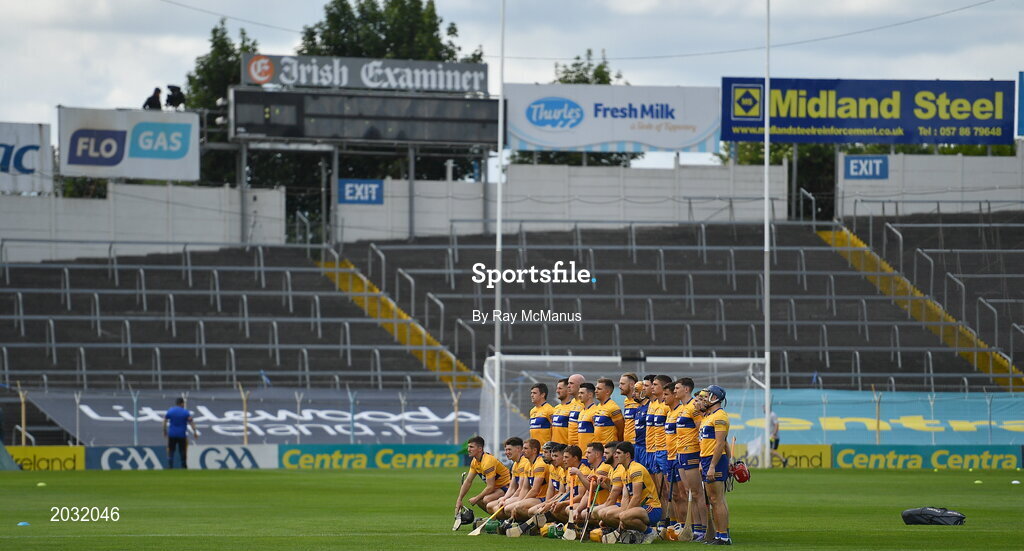 27 June 2021; The Clare squad pose for the traditional 'team photograph' before the Munster GAA Hurling Senior Championship Quarter-Final match between Waterford and Clare at Semple Stadium in Thurles, Tipperary. Photo by Ray McManus/Sportsfile