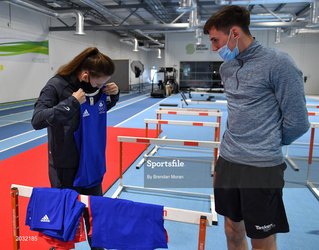 29 June 2021; Michaela Walsh and Aidan Walsh check out the boxing kit during a Tokyo 2020 Team Ireland Announcement for Boxing in the Sport Ireland Institute at the Sport Ireland Campus in Dublin. Photo by Brendan Moran/Sportsfile