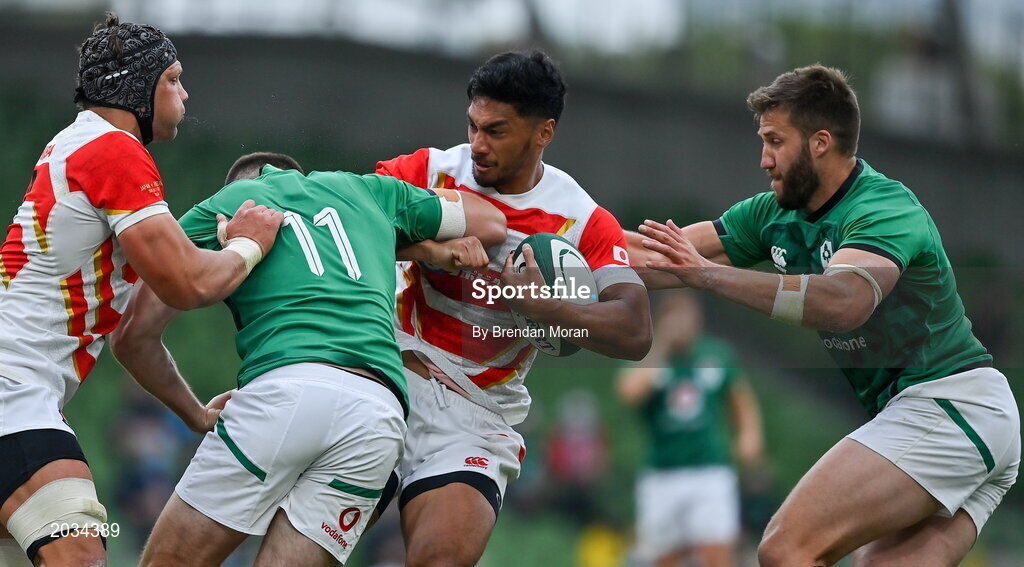 3 July 2021; Timothy Lafaele of Japan is tackled by Jacob Stockdale and Chris Farrell of Ireland during the International Rugby Friendly match between Ireland and Japan at Aviva Stadium in Dublin. Photo by Brendan Moran/Sportsfile