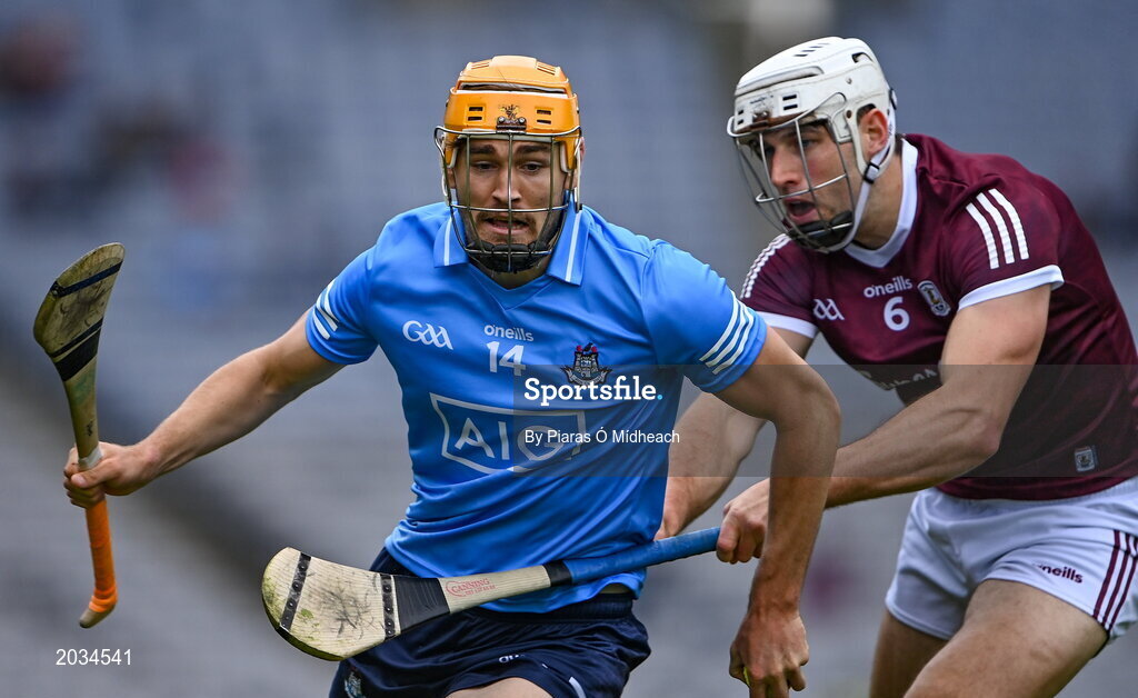 3 July 2021; Ronan Hayes of Dublin in action against Gearóid McInerney of Galway during the Leinster GAA Hurling Senior Championship Semi-Final match between Dublin and Galway at Croke Park in Dublin. Photo by Piaras Ó Mídheach/Sportsfile