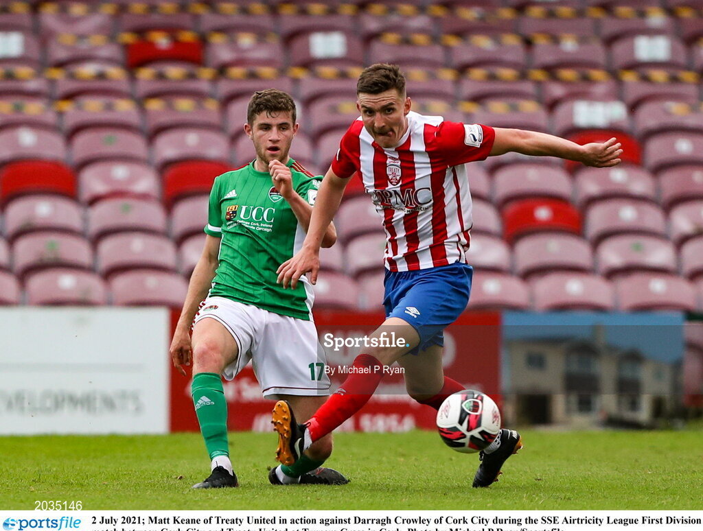 2 July 2021; Matt Keane of Treaty United in action against Darragh Crowley of Cork City during the SSE Airtricity League First Division match between Cork City and Treaty United at Turners Cross in Cork. Photo by Michael P Ryan/Sportsfile