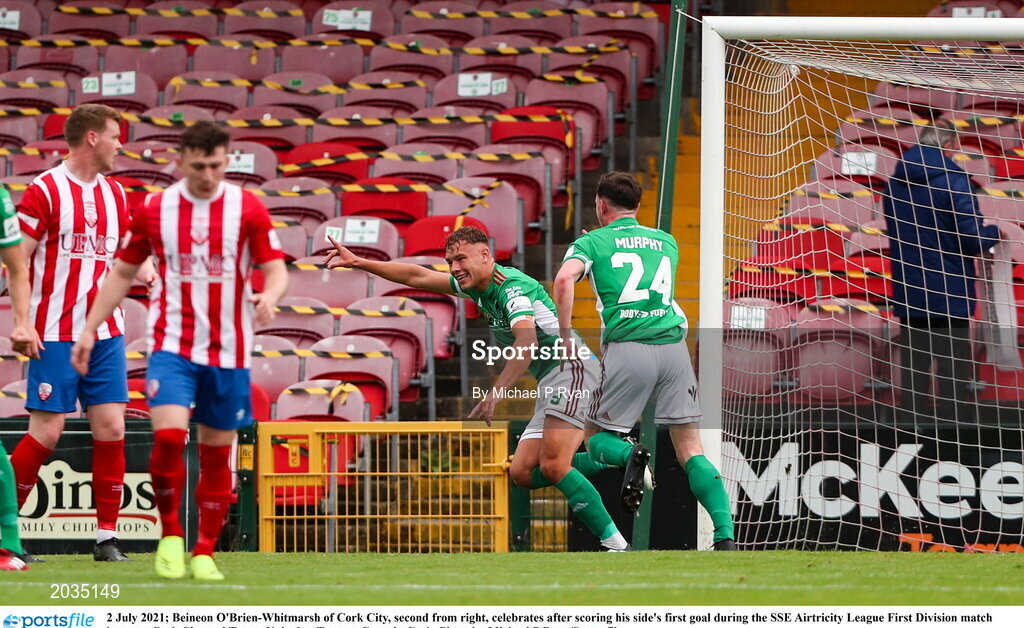 2 July 2021; Beineon O'Brien-Whitmarsh of Cork City, second from right, celebrates after scoring his side's first goal during the SSE Airtricity League First Division match between Cork City and Treaty United at Turners Cross in Cork. Photo by Michael P Ryan/Sportsfile