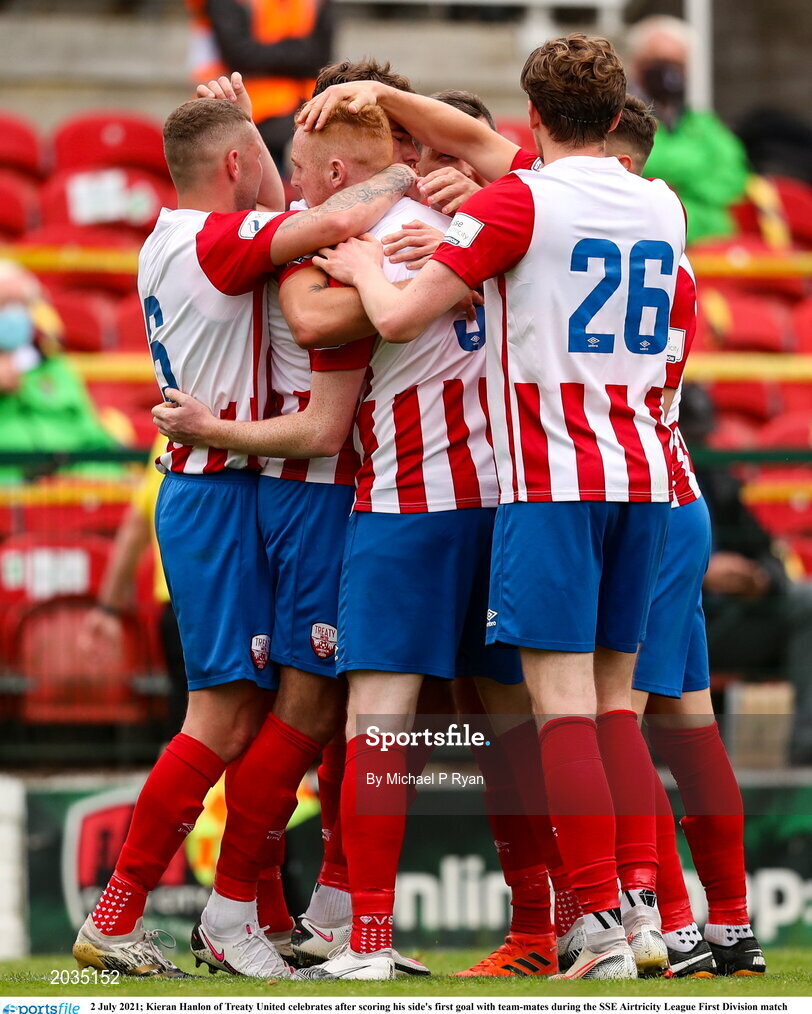 2 July 2021; Kieran Hanlon of Treaty United celebrates after scoring his side's first goal with team-mates during the SSE Airtricity League First Division match between Cork City and Treaty United at Turners Cross in Cork. Photo by Michael P Ryan/Sportsfile