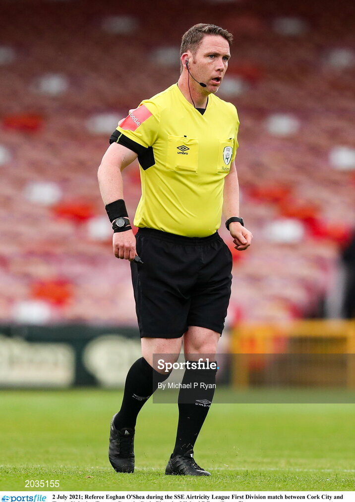 2 July 2021; Referee Eoghan O'Shea during the SSE Airtricity League First Division match between Cork City and Treaty United at Turners Cross in Cork. Photo by Michael P Ryan/Sportsfile