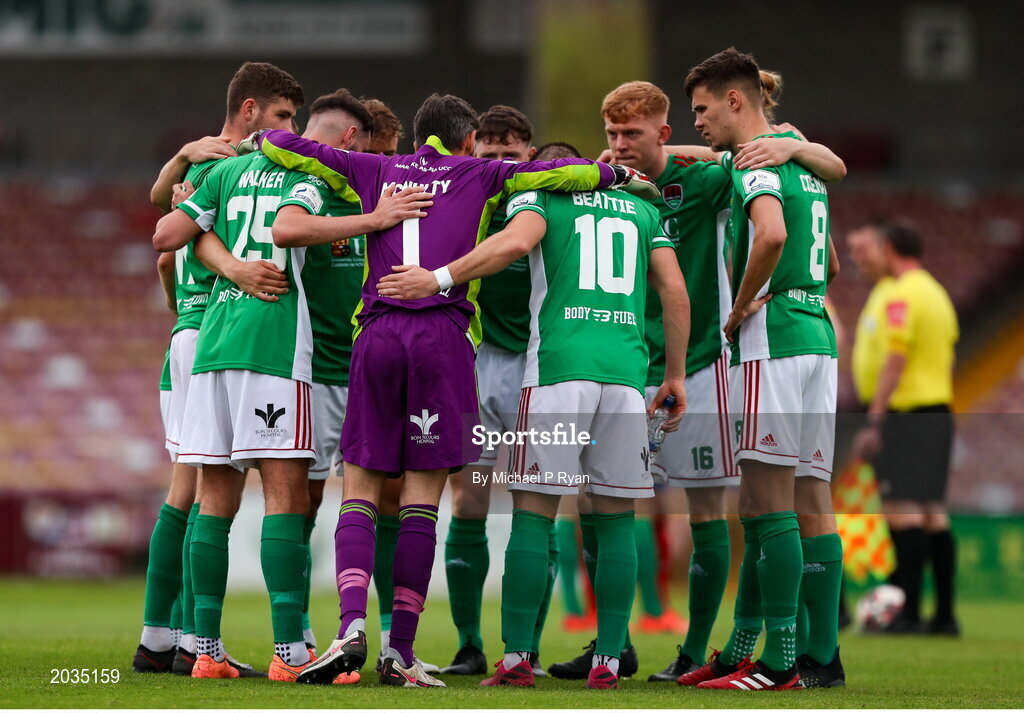 2 July 2021; Cork City players huddle prior to the start of the SSE Airtricity League First Division match between Cork City and Treaty United at Turners Cross in Cork. Photo by Michael P Ryan/Sportsfile