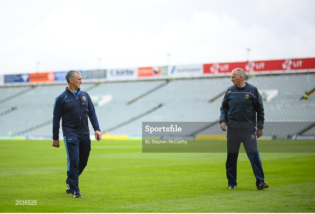 4 July 2021; Tipperary manager Liam Sheedy and selector Eamon O'Shea before the Munster GAA Hurling Senior Championship Semi-Final match between Tipperary and Clare at LIT Gaelic Grounds in Limerick. Photo by Stephen McCarthy/Sportsfile