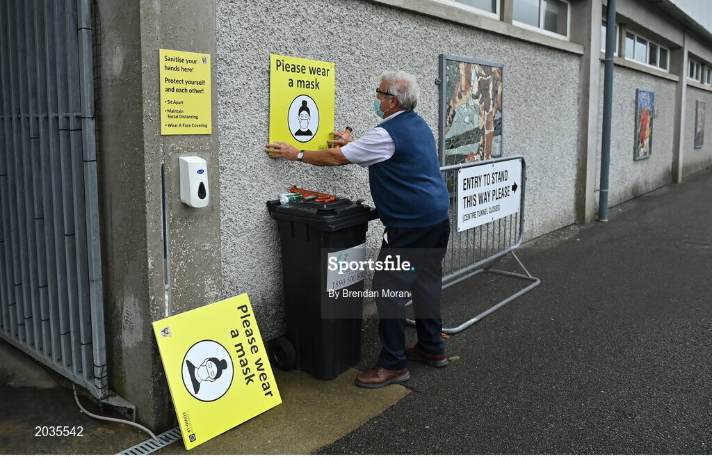 4 July 2021; Wexford county board children's officer Des Croke hangs up covid-19 signage ahead of spectators arrival before the Leinster GAA Football Senior Championship Quarter-Final match between Wexford and Dublin at Chadwicks Wexford Park in Wexford. Photo by Brendan Moran/Sportsfile