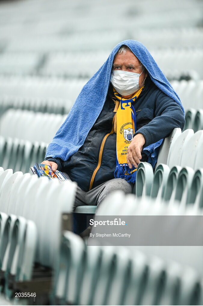 4 July 2021; Clare supporter Steven Murrihy from Quilty, Co Clare sits in the open stand before the Munster GAA Hurling Senior Championship Semi-Final match between Tipperary and Clare at LIT Gaelic Grounds in Limerick. Photo by Stephen McCarthy/Sportsfile