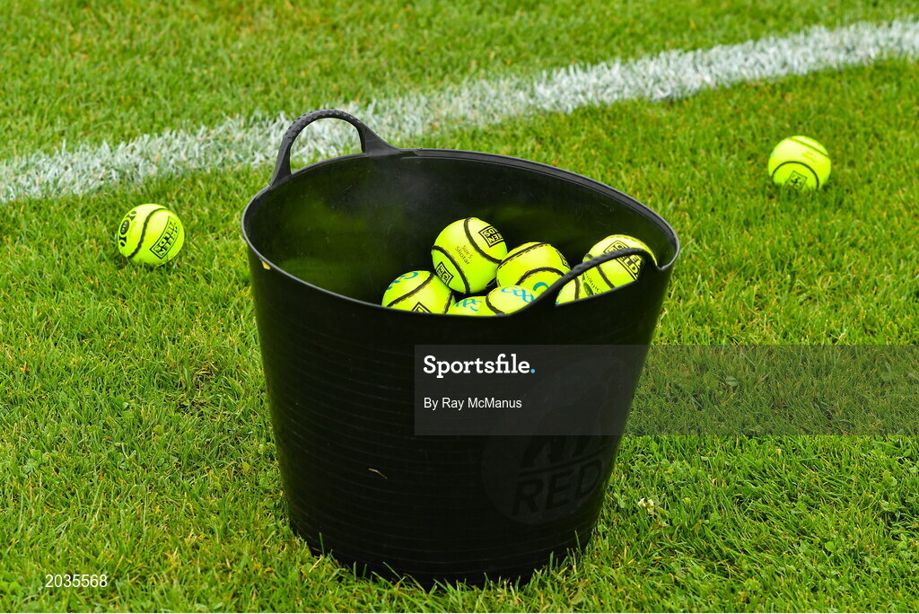 4 July 2021; A bucket of 'Green Fields' sliotars await the arrival of the Clare team before the Munster GAA Hurling Senior Championship Semi-Final match between Tipperary and Clare at LIT Gaelic Grounds in Limerick. Photo by Ray McManus/Sportsfile