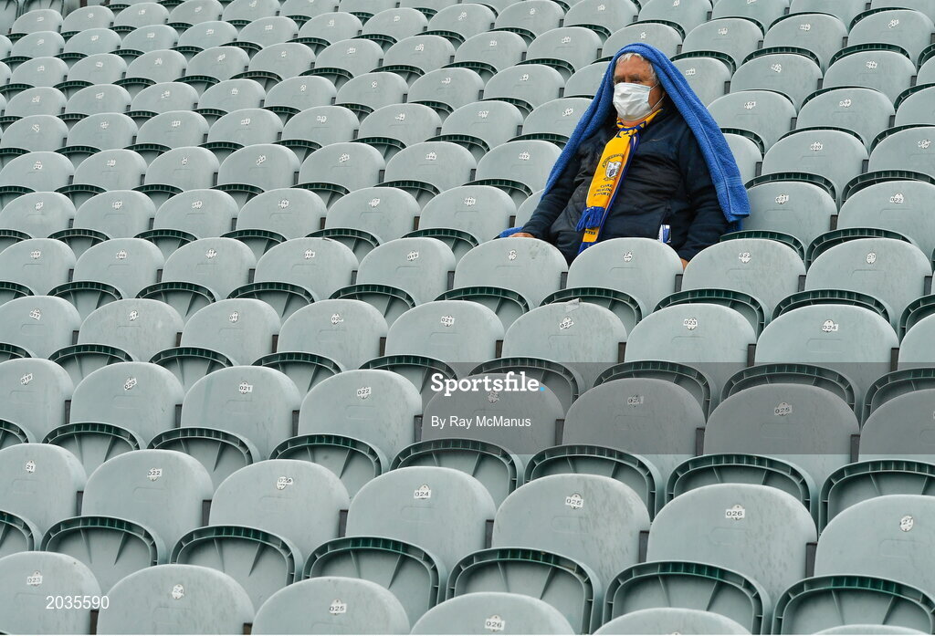4 July 2021; Clare supporter Steven Murrihy from Quilty, Co Clare sits in the open stand before the Munster GAA Hurling Senior Championship Semi-Final match between Tipperary and Clare at LIT Gaelic Grounds in Limerick. Photo by Ray McManus/Sportsfile