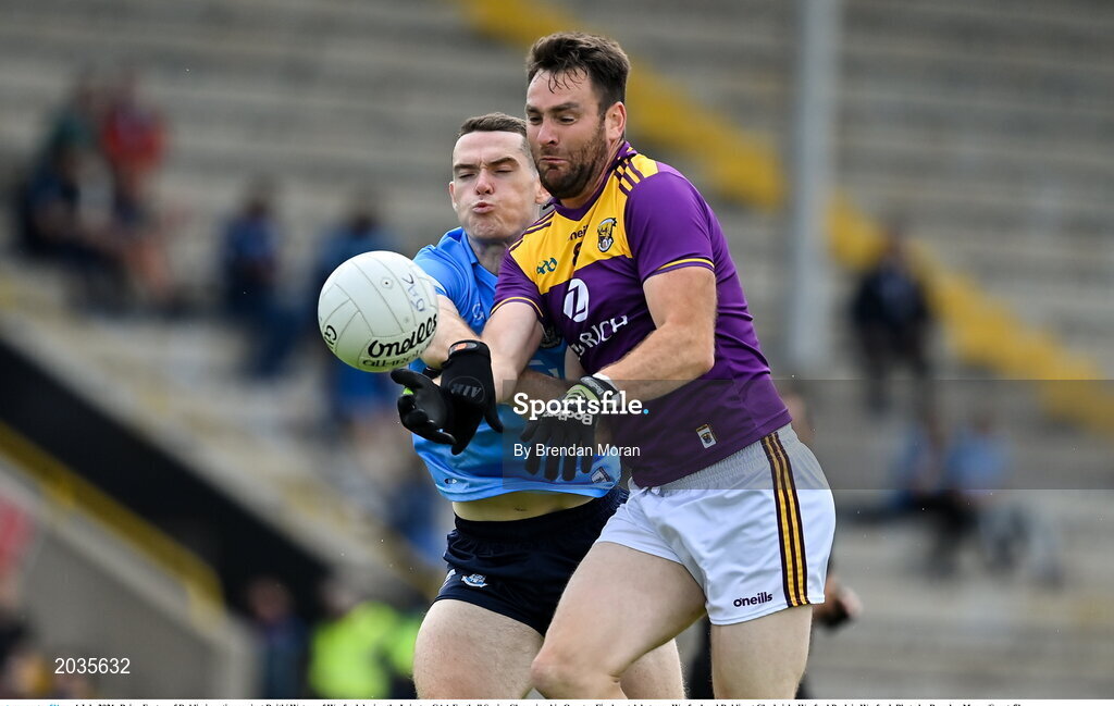 4 July 2021; Brian Fenton of Dublin in action against Daithí Waters of Wexford during the Leinster GAA Football Senior Championship Quarter-Final match between Wexford and Dublin at Chadwicks Wexford Park in Wexford. Photo by Brendan Moran/Sportsfile