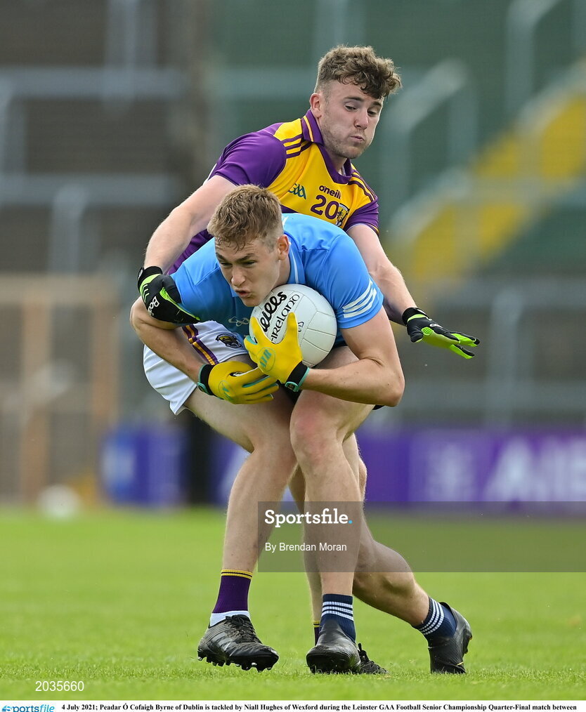 4 July 2021; Peadar Ó Cofaigh Byrne of Dublin is tackled by Niall Hughes of Wexford during the Leinster GAA Football Senior Championship Quarter-Final match between Wexford and Dublin at Chadwicks Wexford Park in Wexford. Photo by Brendan Moran/Sportsfile