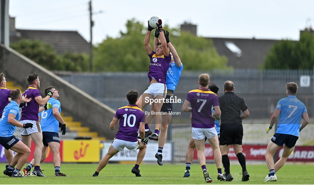 4 July 2021; Liam Coleman of Wexford catches a kickout ahead of Brian Fenton of Dublin during the Leinster GAA Football Senior Championship Quarter-Final match between Wexford and Dublin at Chadwicks Wexford Park in Wexford. Photo by Brendan Moran/Sportsfile