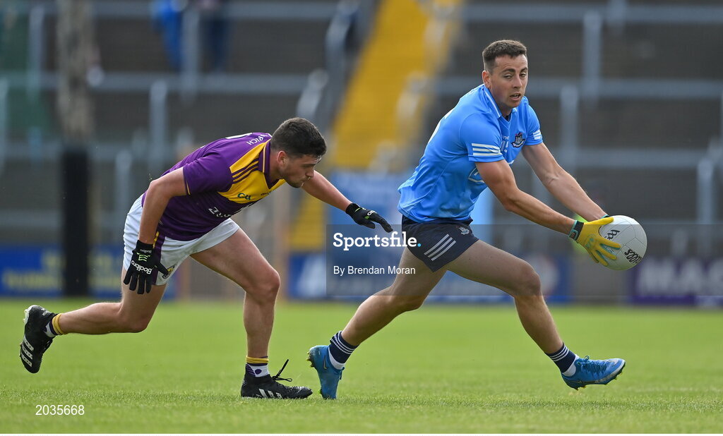 4 July 2021; Cormac Costello of Dublin in action against Liam O'Connor of Wexford during the Leinster GAA Football Senior Championship Quarter-Final match between Wexford and Dublin at Chadwicks Wexford Park in Wexford. Photo by Brendan Moran/Sportsfile