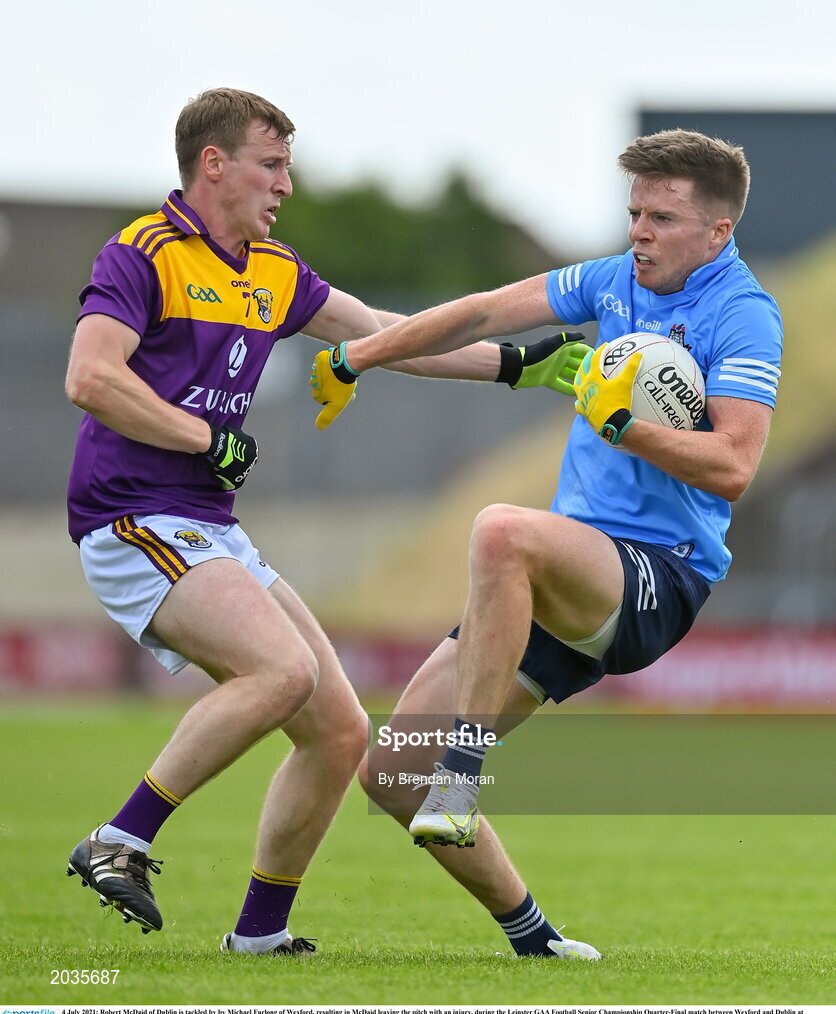 4 July 2021; Robert McDaid of Dublin is tackled by by Michael Furlong of Wexford, resulting in McDaid leaving the pitch with an injury, during the Leinster GAA Football Senior Championship Quarter-Final match between Wexford and Dublin at Chadwicks Wexford Park in Wexford. Photo by Brendan Moran/Sportsfile