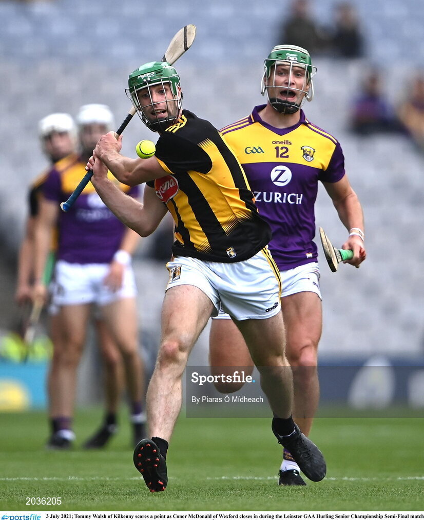 3 July 2021; Tommy Walsh of Kilkenny scores a point as Conor McDonald of Wexford closes in during the Leinster GAA Hurling Senior Championship Semi-Final match between Kilkenny and Wexford at Croke Park in Dublin. Photo by Piaras Ó Mídheach/Sportsfile