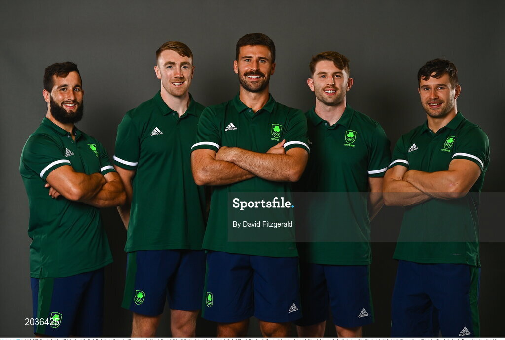 6 July 2021; Team Ireland has officially selected the Men’s Rugby Sevens Team who will compete at the Olympic Games in Tokyo. Following their exciting dominance in the final Olympic Repechage in Monaco, the Irish team have made history in becoming the first Rugby team that will compete for Ireland at the Olympic Games. Pictured are Team Ireland rugby 7's squad members, from left, Mark Roche, Terry Kennedy, Harry McNulty, Ian Fitzpatrick and Foster Horan during a Tokyo 2020 Official Team Ireland Announcement for Rugby 7s at Sport Ireland Campus in Dublin. Photo by David Fitzgerald/Sportsfile