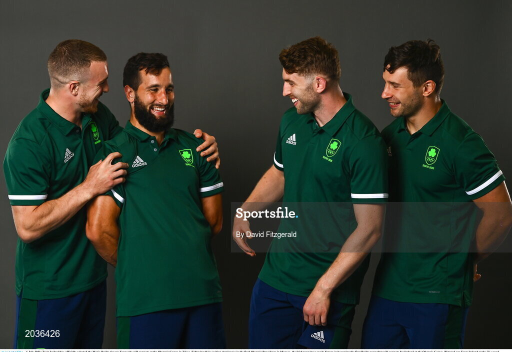 6 July 2021; Team Ireland has officially selected the Men’s Rugby Sevens Team who will compete at the Olympic Games in Tokyo. Following their exciting dominance in the final Olympic Repechage in Monaco, the Irish team have made history in becoming the first Rugby team that will compete for Ireland at the Olympic Games. Pictured are Team Ireland rugby 7's squad members, from left, Adam Leavy, Mark Roche, Ian Fitzpatrick and Foster Horan during a Tokyo 2020 Official Team Ireland Announcement for Rugby 7s at Sport Ireland Campus in Dublin. Photo by David Fitzgerald/Sportsfile