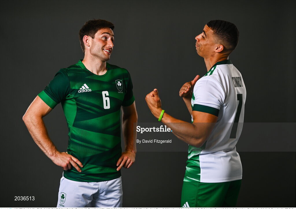 6 July 2021; Team Ireland has officially selected the Men’s Rugby Sevens Team who will compete at the Olympic Games in Tokyo. Following their exciting dominance in the final Olympic Repechage in Monaco, the Irish team have made history in becoming the first Rugby team that will compete for Ireland at the Olympic Games. Pictured are Team Ireland rugby 7's squad members Billy Dardis, left, and Jordan Conroy during a Tokyo 2020 Official Team Ireland Announcement for Rugby 7s at Sport Ireland Campus in Dublin. Photo by David Fitzgerald/Sportsfile