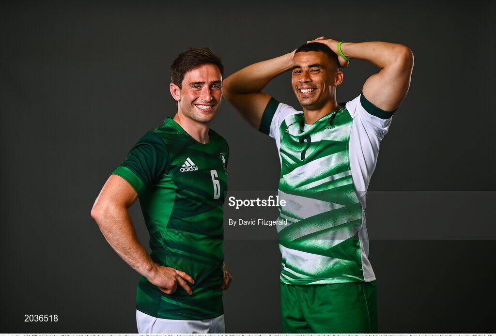 6 July 2021; Team Ireland has officially selected the Men’s Rugby Sevens Team who will compete at the Olympic Games in Tokyo. Following their exciting dominance in the final Olympic Repechage in Monaco, the Irish team have made history in becoming the first Rugby team that will compete for Ireland at the Olympic Games. Pictured are Team Ireland rugby 7's squad members Billy Dardis, left, and Jordan Conroy during a Tokyo 2020 Official Team Ireland Announcement for Rugby 7s at Sport Ireland Campus in Dublin. Photo by David Fitzgerald/Sportsfile