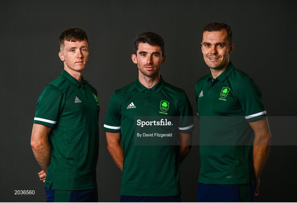 5 July 2021; Team Ireland track cyclists, from left, Fintan Ryan, Felix English and Mark Downey during a Tokyo 2020 Official Team Ireland Announcement for Cycling at Sport Ireland Campus in Dublin. Photo by David Fitzgerald/Sportsfile