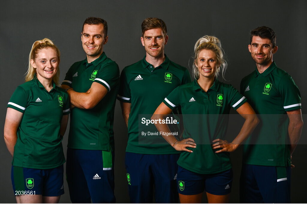 8 July 2021; Team Ireland track cyclists, from left, Emily Kay, Mark Downey, head coach Martyn Irvine, Shannon McCurley and Felix English on the day they received their Olympic kit for Tokyo 2020. They will be competing in the Izu Velodrome from the 5 – 8 August. Photo by David Fitzgerald/Sportsfile