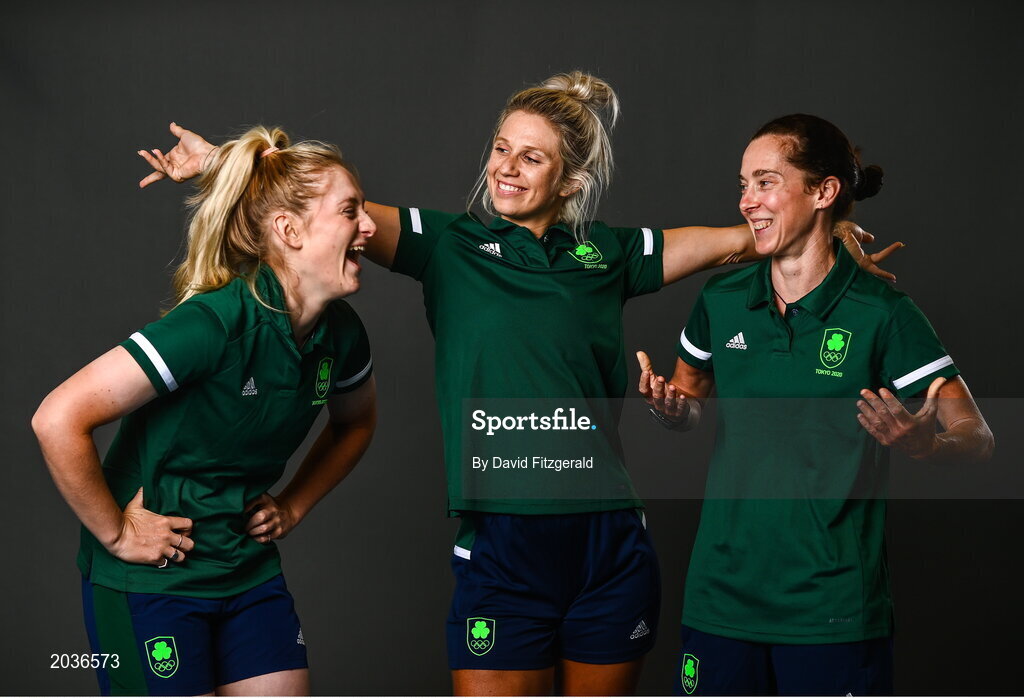 5 July 2021; Team Ireland track cyclists, from left, Emily Kay, Shannon McCurley and Lydia Gurley during a Tokyo 2020 Official Team Ireland Announcement for Cycling at Sport Ireland Campus in Dublin. Photo by David Fitzgerald/Sportsfile