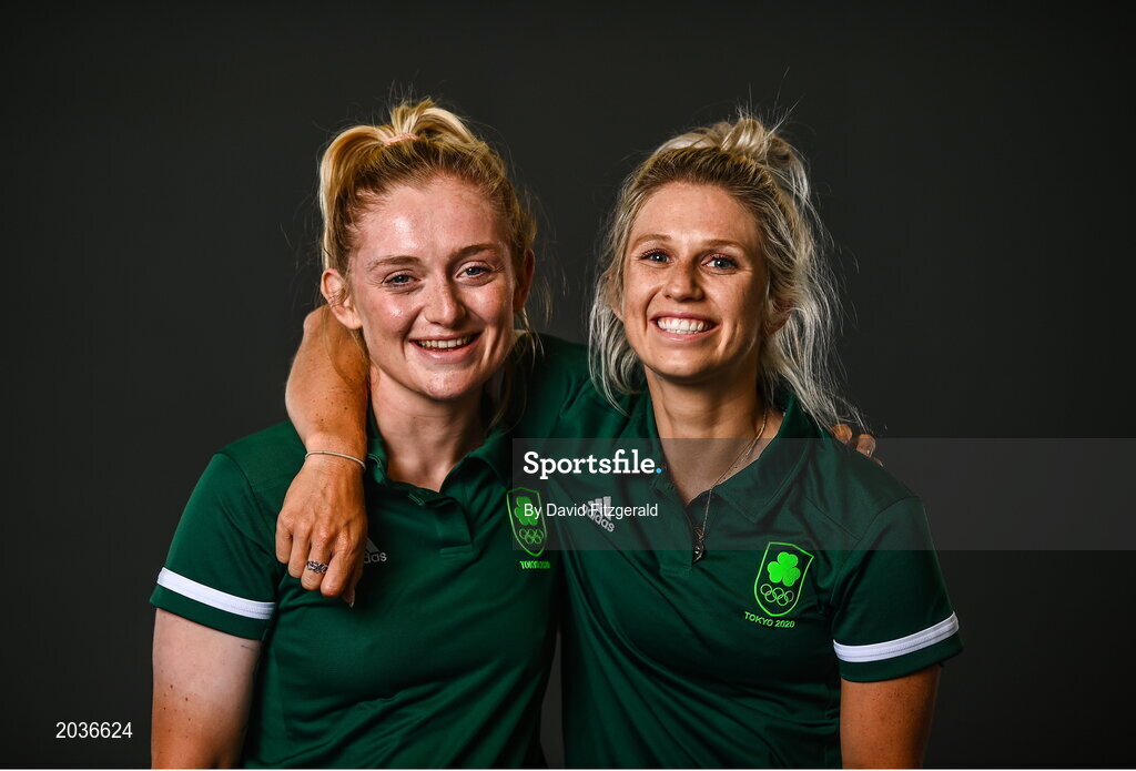 5 July 2021; Track cyclists Emily Kay, left, and Shannon McCurley during a Tokyo 2020 Official Team Ireland Announcement for Cycling at Sport Ireland Campus in Dublin. Photo by David Fitzgerald/Sportsfile