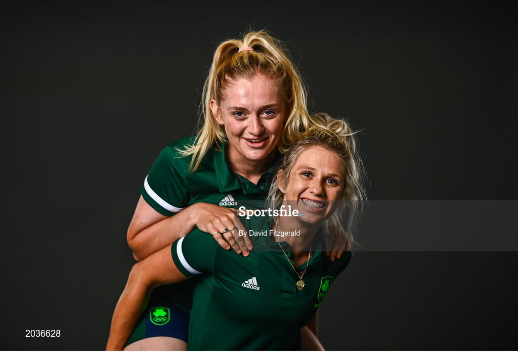 5 July 2021; Track cyclists Emily Kay, left, and Shannon McCurley during a Tokyo 2020 Official Team Ireland Announcement for Cycling at Sport Ireland Campus in Dublin. Photo by David Fitzgerald/Sportsfile
