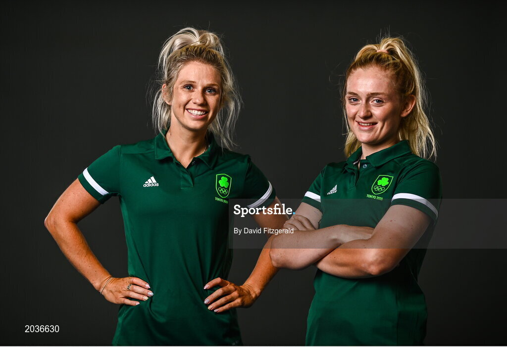 8 July 2021; Team Ireland track cyclists Shannon McCurley, left, and Emily Kay on the day they received their Olympic kit for Tokyo 2020. They will be competing in the Izu Velodrome from the 5 – 8 August. Photo by David Fitzgerald/Sportsfile