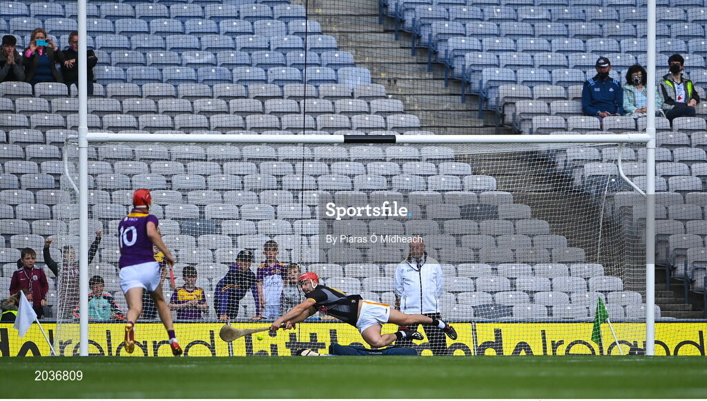 3 July 2021; Kilkenny goalkeeper Darren Brennan is beaten for a goal by a penalty from Wexford goalkeeper Mark Fanning during the Leinster GAA Hurling Senior Championship Semi-Final match between Kilkenny and Wexford at Croke Park in Dublin. Photo by Piaras Ó Mídheach/Sportsfile