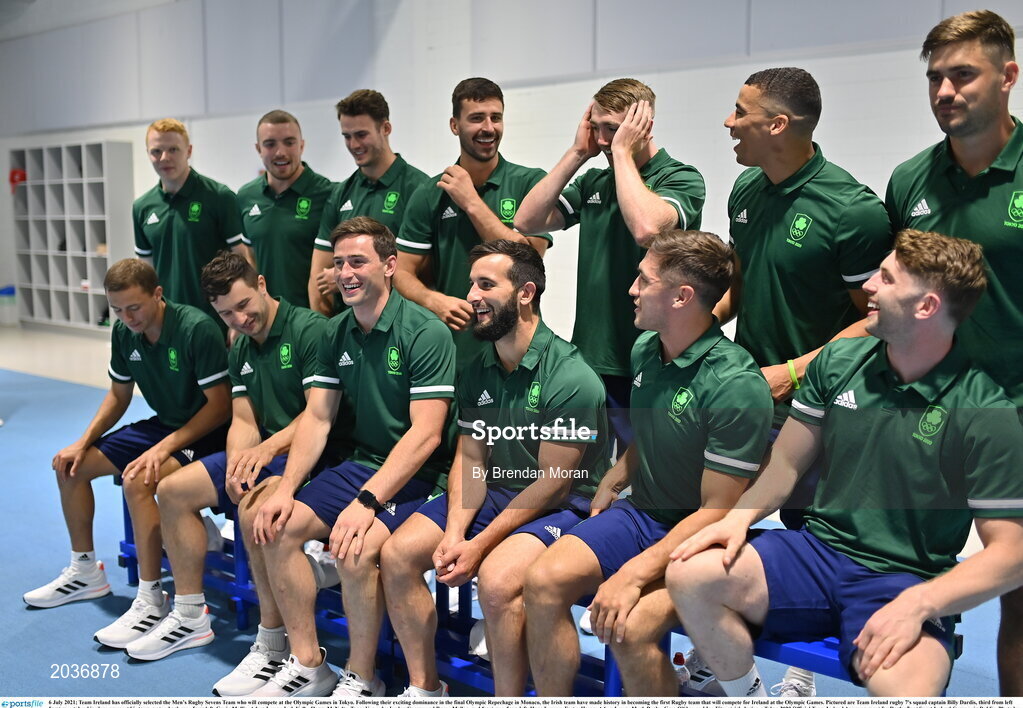 6 July 2021; Team Ireland has officially selected the Men’s Rugby Sevens Team who will compete at the Olympic Games in Tokyo. Following their exciting dominance in the final Olympic Repechage in Monaco, the Irish team have made history in becoming the first Rugby team that will compete for Ireland at the Olympic Games. Pictured are Team Ireland rugby 7's squad captain Billy Dardis, third from left front row, takes his place amongst his team-mates, back row, from left, Gavin Mullin, Adam Leavy, Jack Kelly, Harry McNulty, Terry Kennedy, Jordan Conroy and Bryan Mollen, and front row, from left, Hugo Lennox, Foster Horan, Adam Leavy, Mark Roche, Greg O'Shea and Ian Fitzpatrick during a Tokyo 2020 Official Team Ireland Announcement for Rugby 7s at Sport Ireland Campus in Dublin. Photo by Brendan Moran/Sportsfile