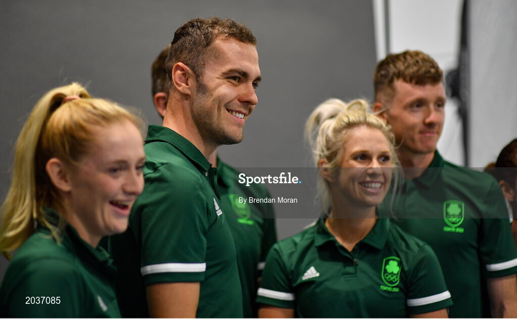 8 July 2021; Team Ireland track cyclists, Emily Kay, Mark Downey, Shannon McCurley and Fintan Ryan on the day they received their Olympic kit for Tokyo 2020. They will be competing in the Izu Velodrome from the 5 – 8 August. Photo by Brendan Moran/Sportsfile