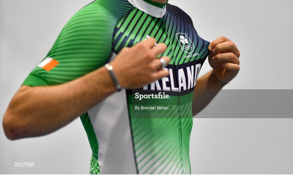 5 July 2021; Detail view of team Ireland track cycling kit during a Tokyo 2020 Official Team Ireland Announcement for Cycling at Sport Ireland Campus in Dublin. Photo by Brendan Moran/Sportsfile