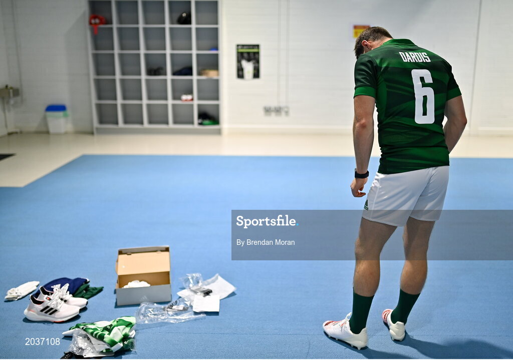 5 July 2021; Captain Billy Dardis check out the team kit during a Tokyo 2020 Official Team Ireland Announcement for Rugby 7s at Sport Ireland Campus in Dublin. Photo by Brendan Moran/Sportsfile