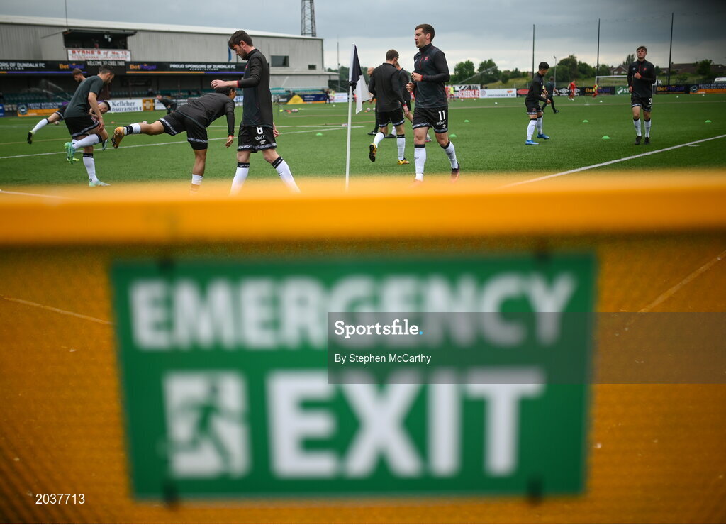 8 July 2021; Patrick McEleney, 11, and Dundalk team-mates warm up before the UEFA Europa Conference League first qualifying round first leg match between Dundalk and Newtown at Oriel Park in Dundalk, Louth. Photo by Stephen McCarthy/Sportsfile