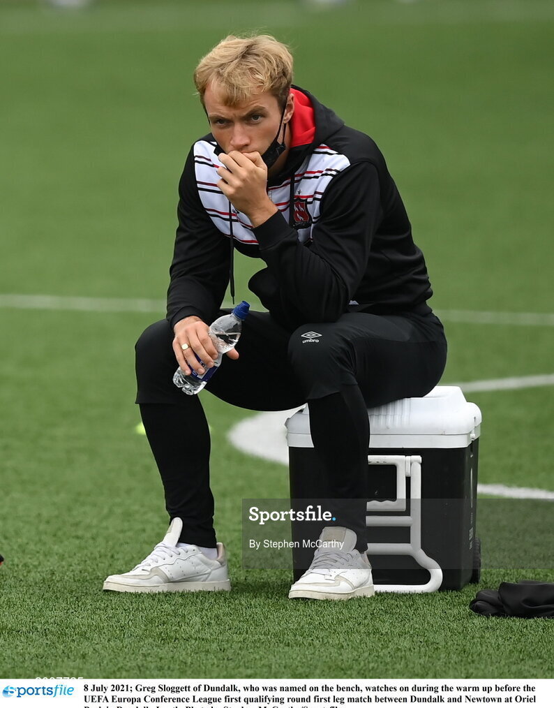8 July 2021; Greg Sloggett of Dundalk, who was named on the bench, watches on during the warm up before the UEFA Europa Conference League first qualifying round first leg match between Dundalk and Newtown at Oriel Park in Dundalk, Louth. Photo by Stephen McCarthy/Sportsfile