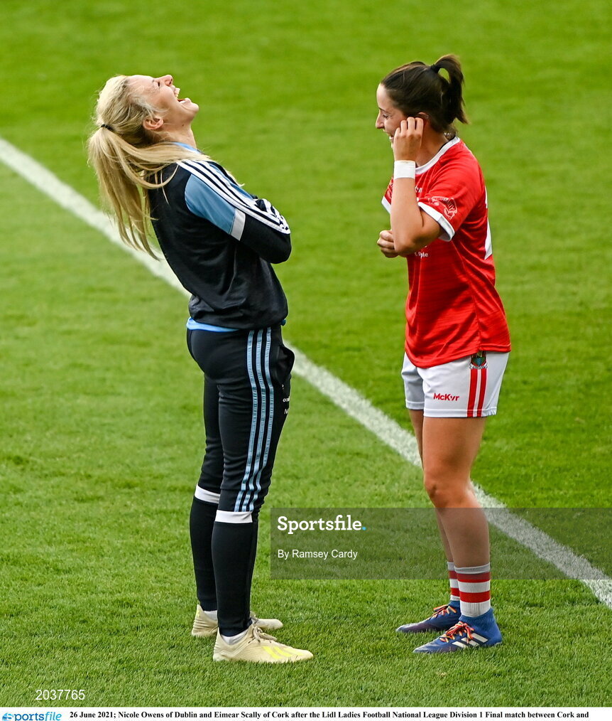 26 June 2021; Nicole Owens of Dublin and Eimear Scally of Cork after the Lidl Ladies Football National League Division 1 Final match between Cork and Dublin at Croke Park in Dublin. Photo by Ramsey Cardy/Sportsfile