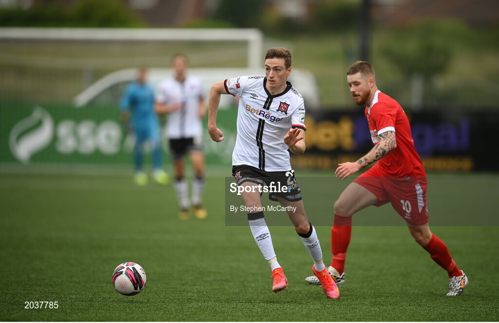 8 July 2021; Daniel Kelly of Dundalk in action against Jordan Evans of Newtown during the UEFA Europa Conference League first qualifying round first leg match between Dundalk and Newtown at Oriel Park in Dundalk, Louth. Photo by Stephen McCarthy/Sportsfile