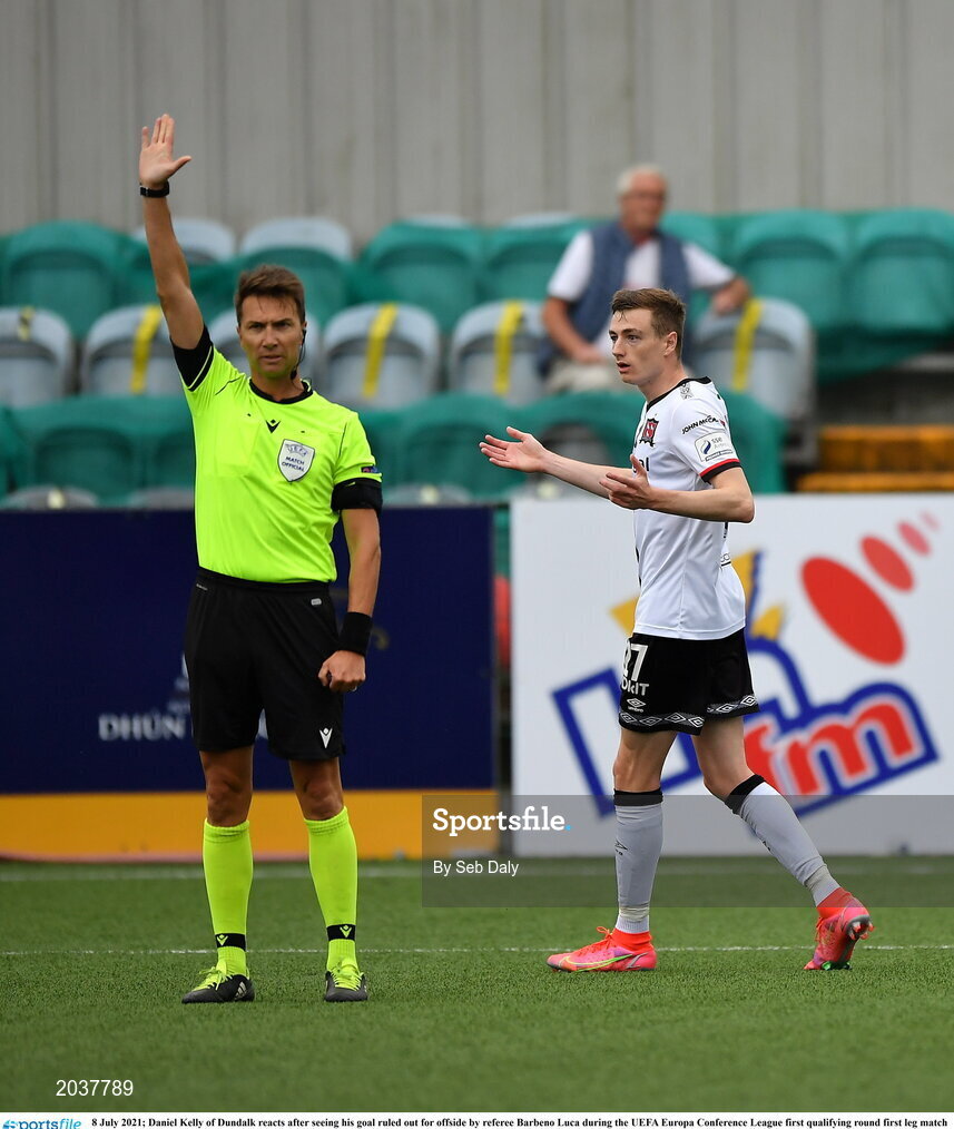 8 July 2021; Daniel Kelly of Dundalk reacts after seeing his goal ruled out for offside by referee Barbeno Luca during the UEFA Europa Conference League first qualifying round first leg match between Dundalk and Newtown at Oriel Park in Dundalk, Louth. Photo by Seb Daly/Sportsfile