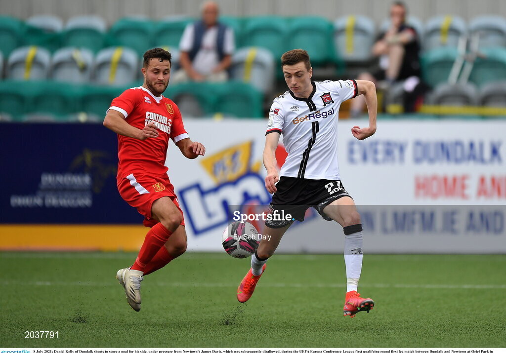 8 July 2021; Daniel Kelly of Dundalk shoots to score a goal for his side, under pressure from Newtown's James Davis, which was subsequently disallowed, during the UEFA Europa Conference League first qualifying round first leg match between Dundalk and Newtown at Oriel Park in Dundalk, Louth. Photo by Seb Daly/Sportsfile